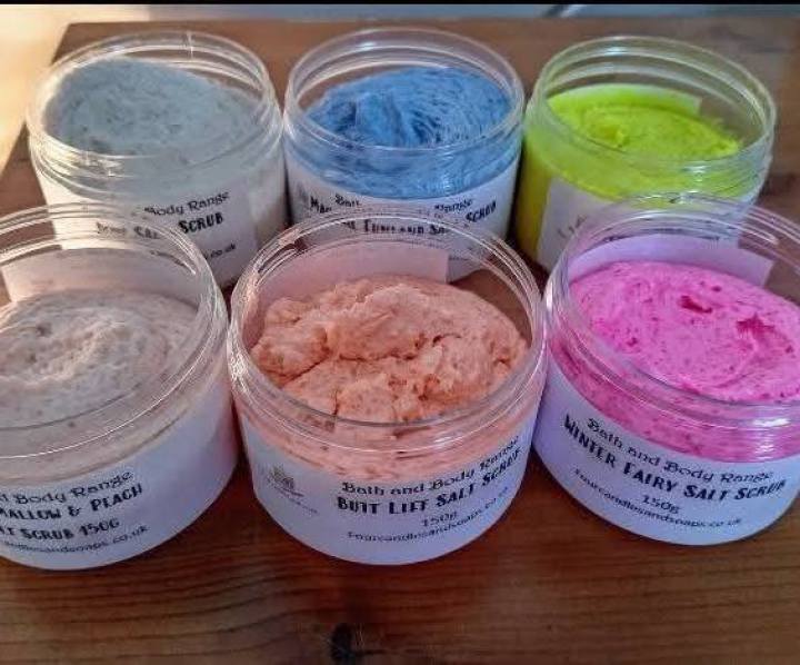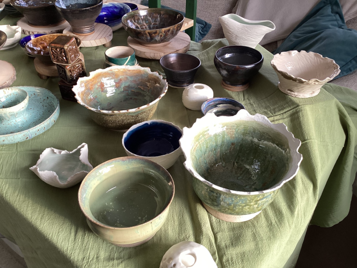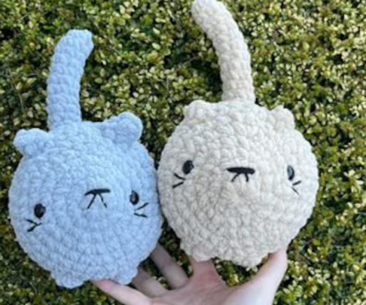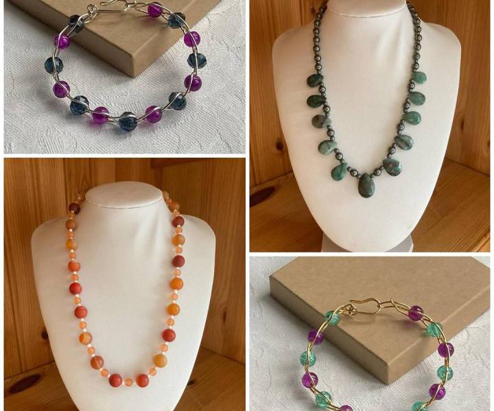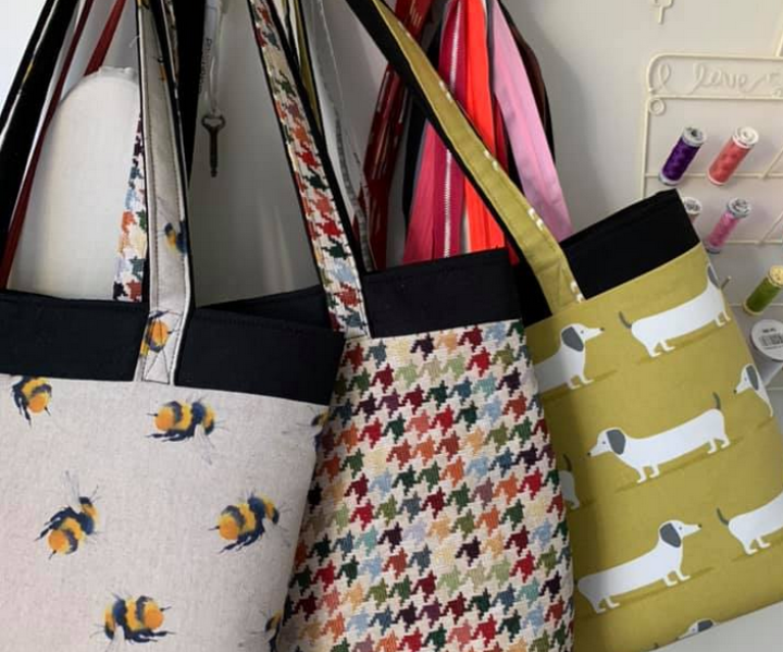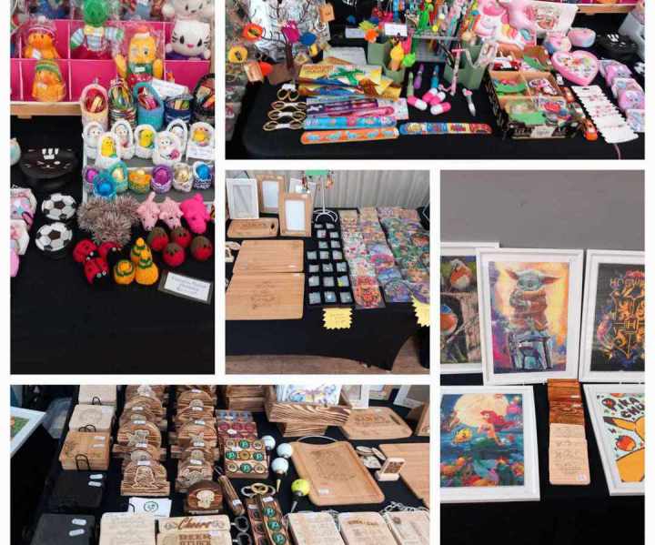 A selection of children's necklaces, handmade knitted items, sewn items such as tote bags, children's cushions covers, knitted baskets with sweets in, pocket