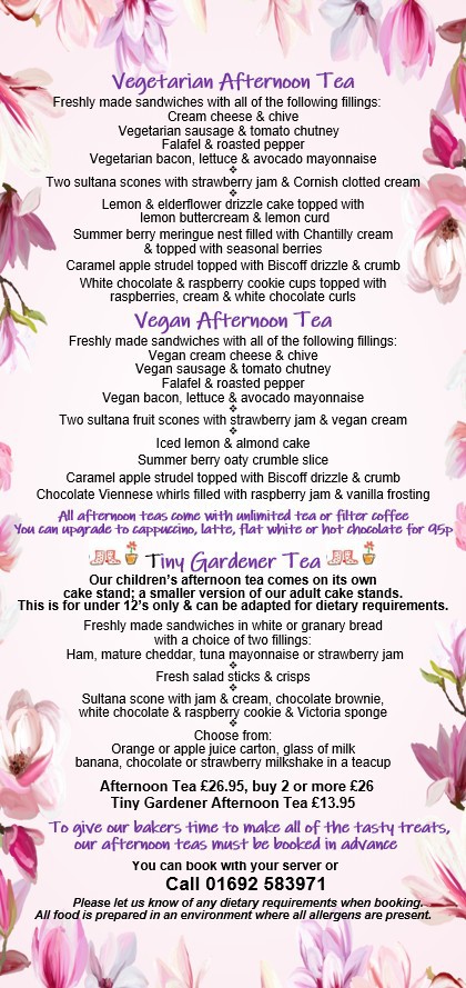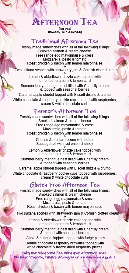 Traditional, Farmer's, Gluten Free, Vegetarian, Vegan/Dairy Free & Children's Afternoon Teas are available.