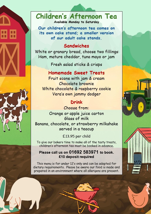 We offer Traditional, Farmer's, Gluten Free, Vegetarian, Vegan & Children's Afternoon Teas, all menus are shown below.