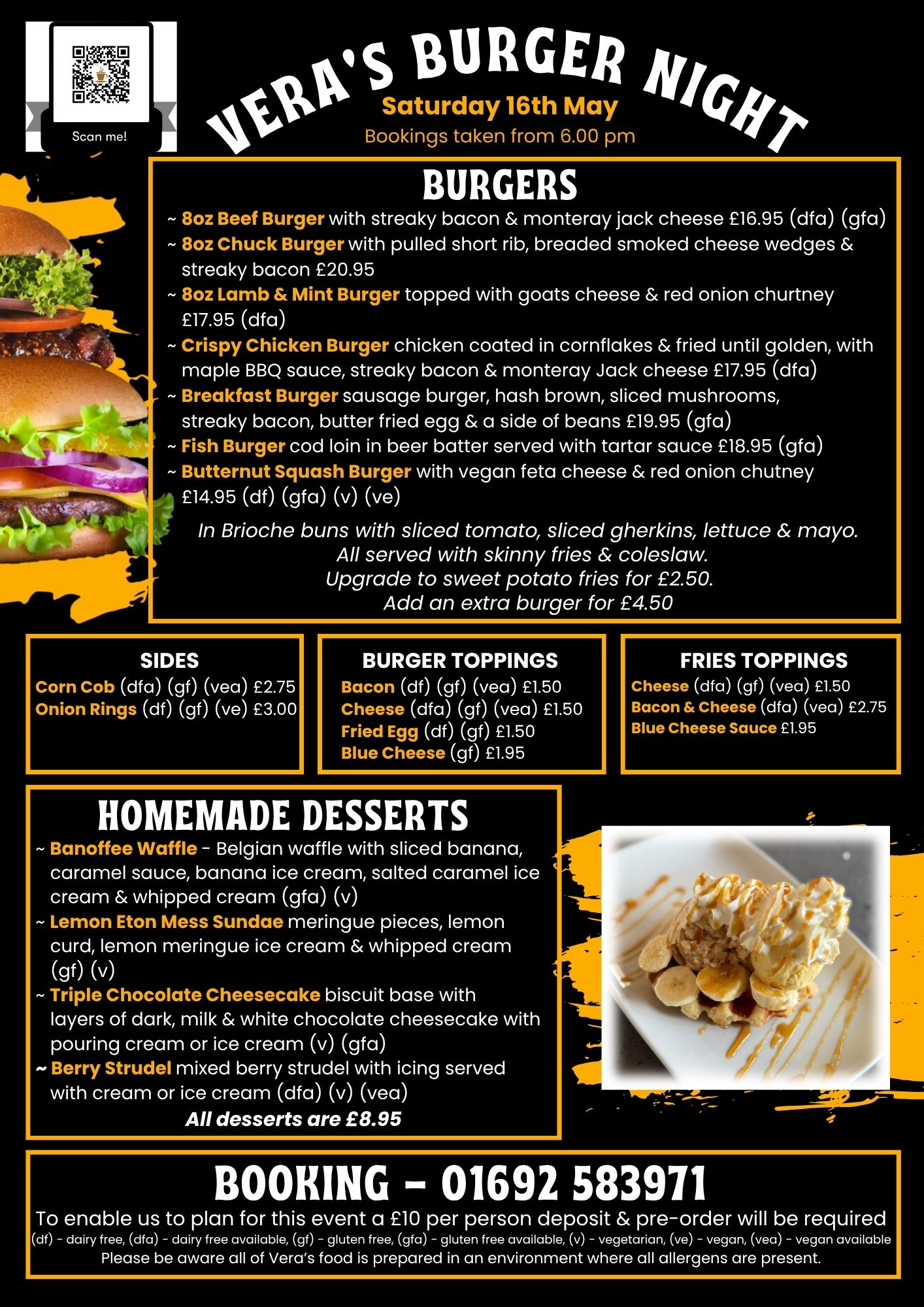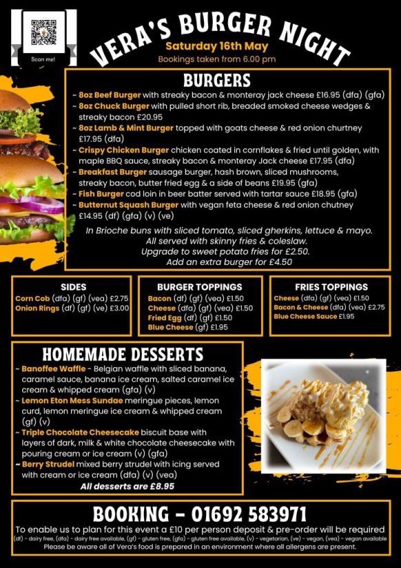 Join us for our Burger Night on Saturday 16th May; bookings taken form 6.00 pm
