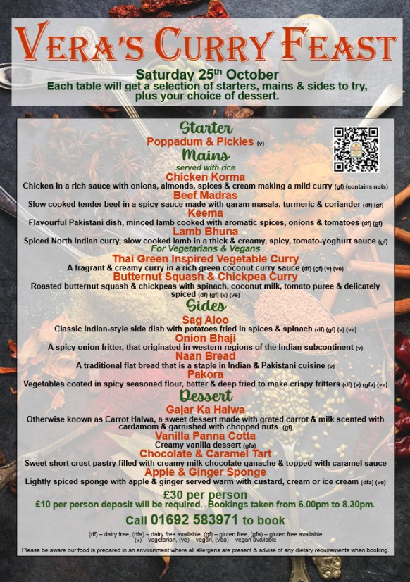 Join us for our Curry Feast where each table gets to sample all of the delicious starters, mains and sides, then choose which dessert you would like.