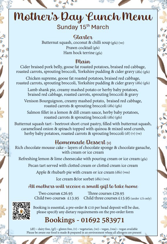 Join us on Mother's Day for lunch with family and friends; freshly prepared on our premises using local & own grown ingredients where possible.