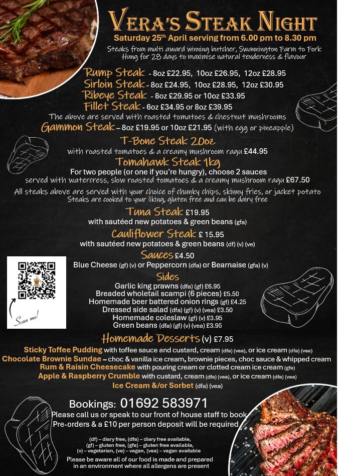 Join us for one of our very popular steak nights, these always sell out really quickly so book early to avoid